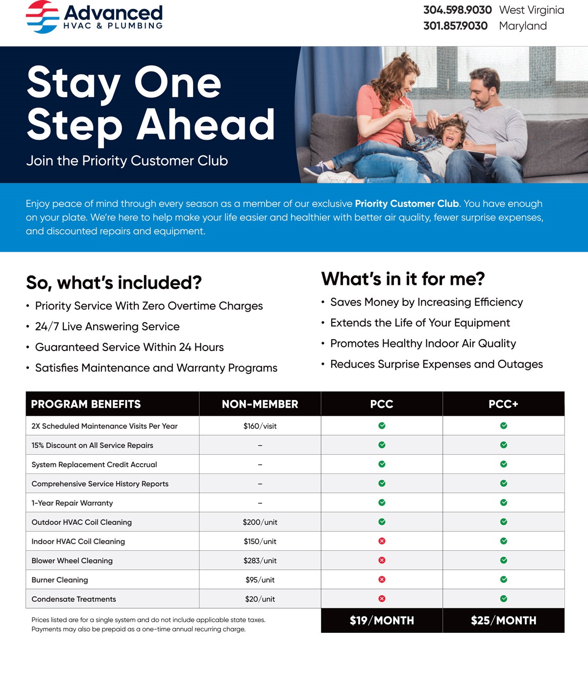 Want to learn more about how you can save money and get the peace of mind of a HVAC service agreement? Read below or click on the following link to view a PDF about the benefits of joining our Priority Customer Club.